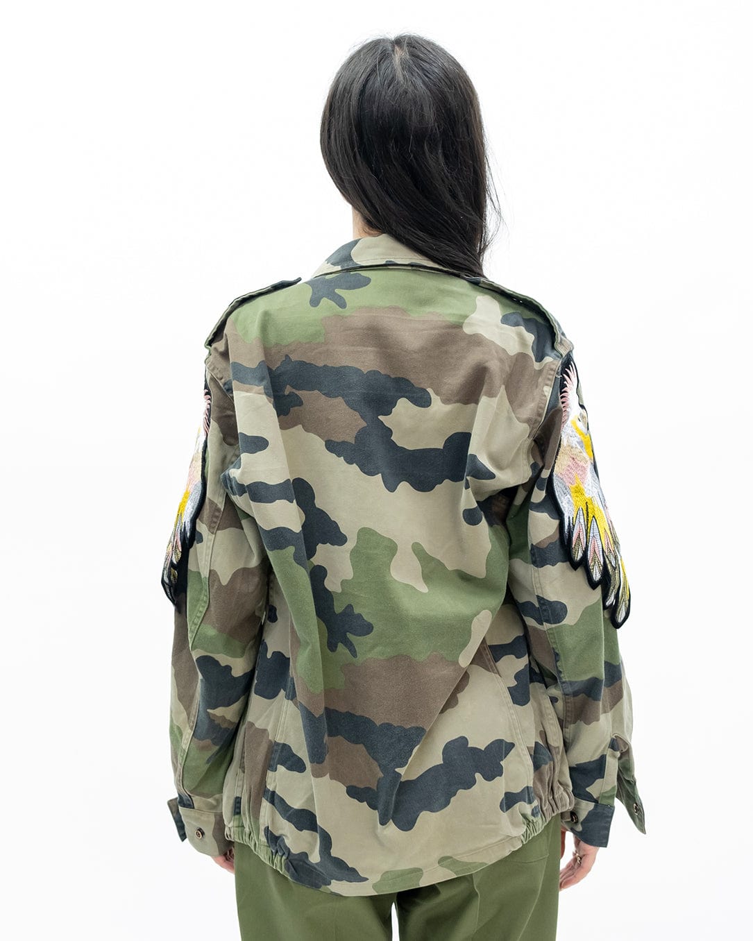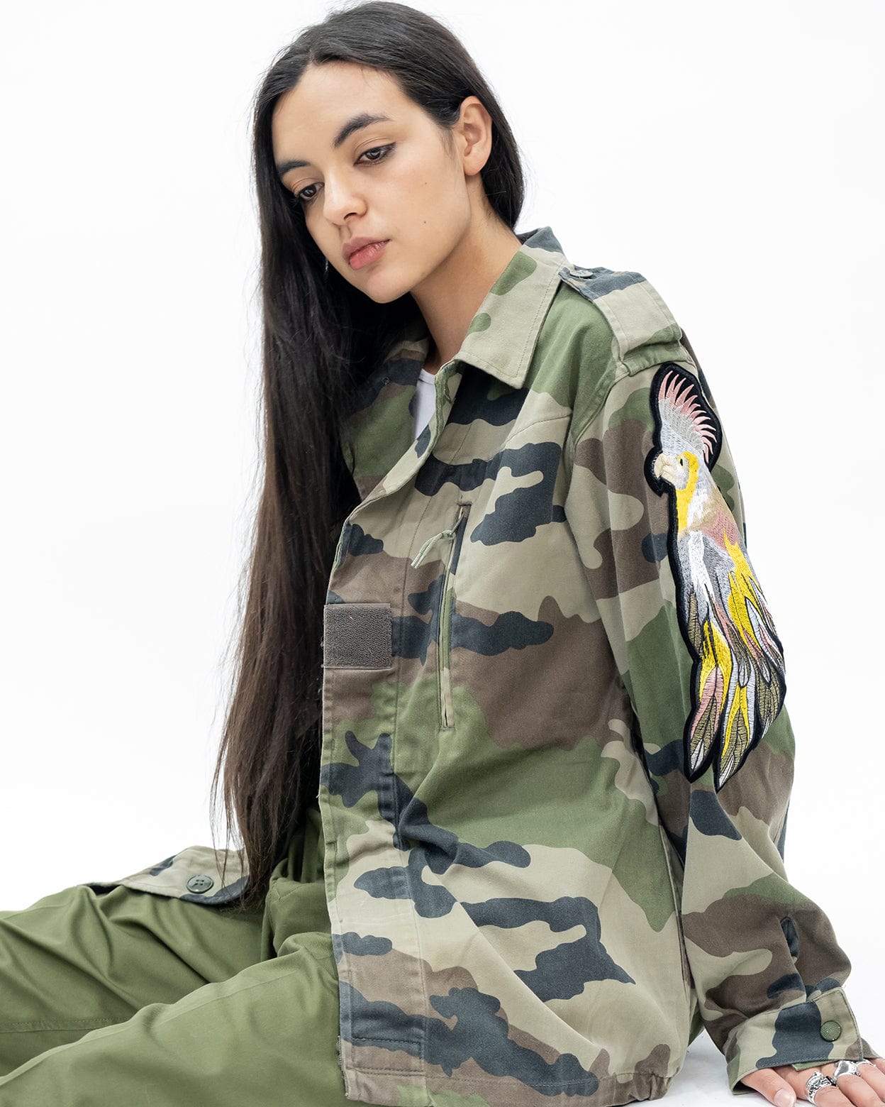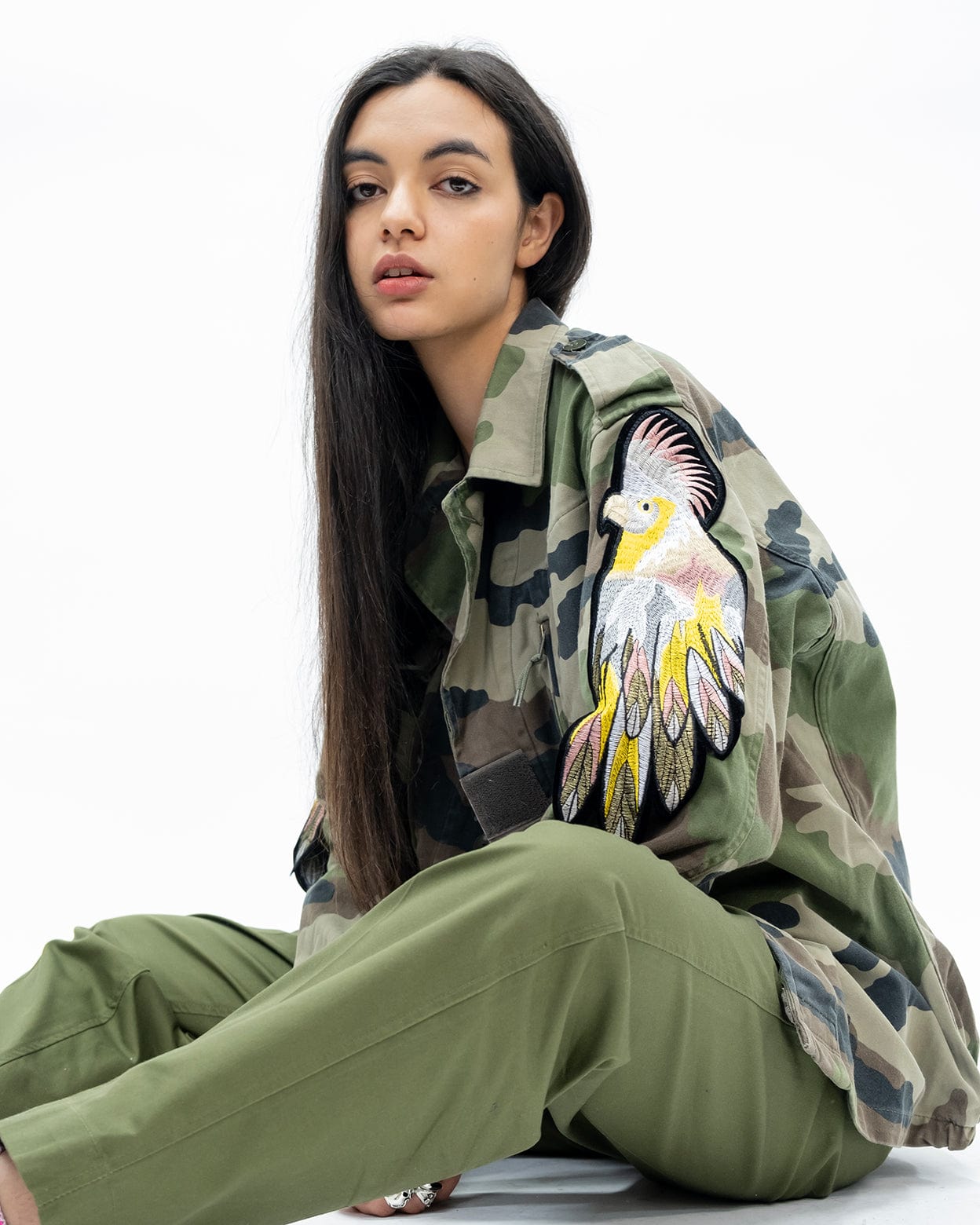 Metallic embroidered parrot-inspired appliqué shoulder patch sleeved customised army jacket with pockets and lapels.