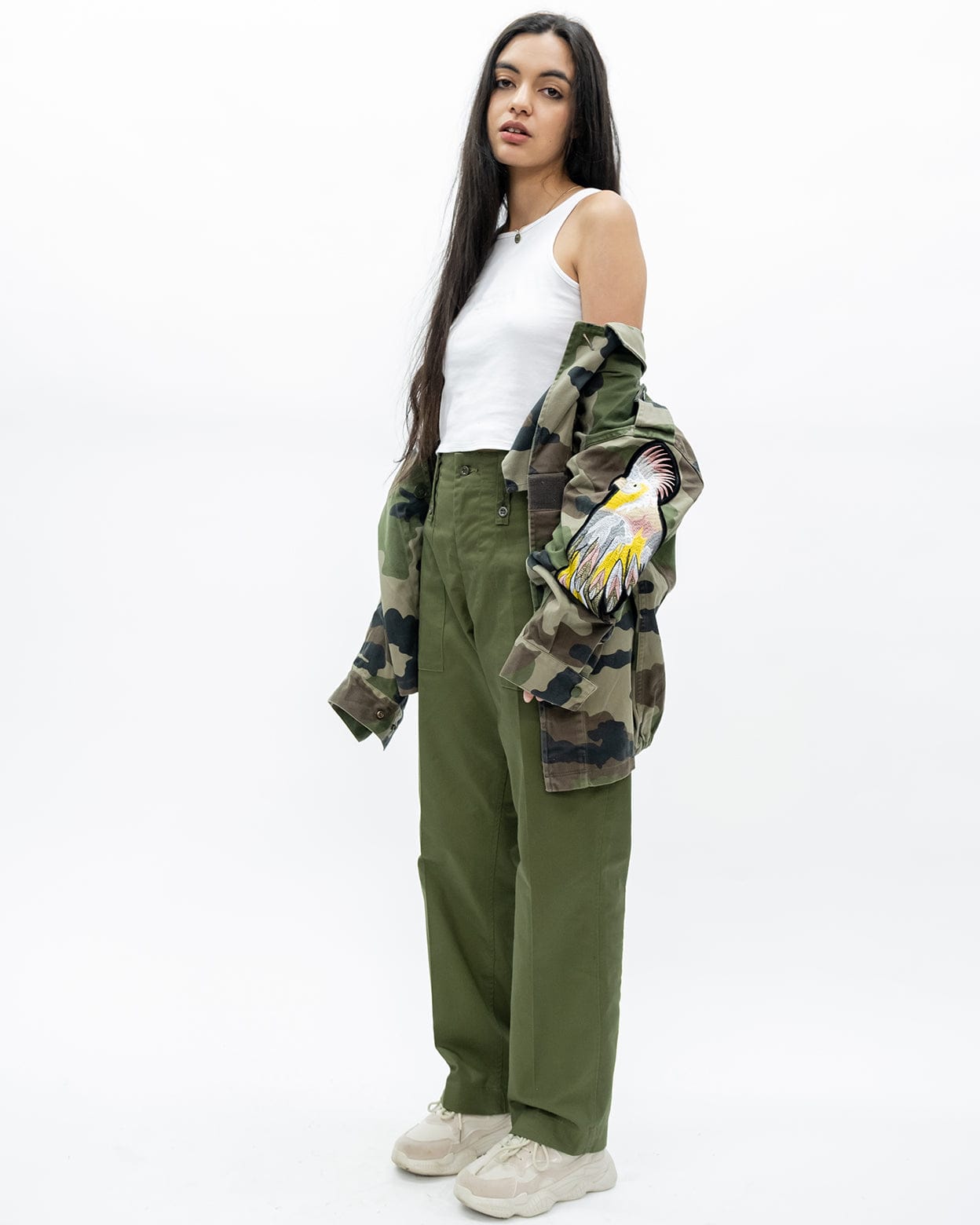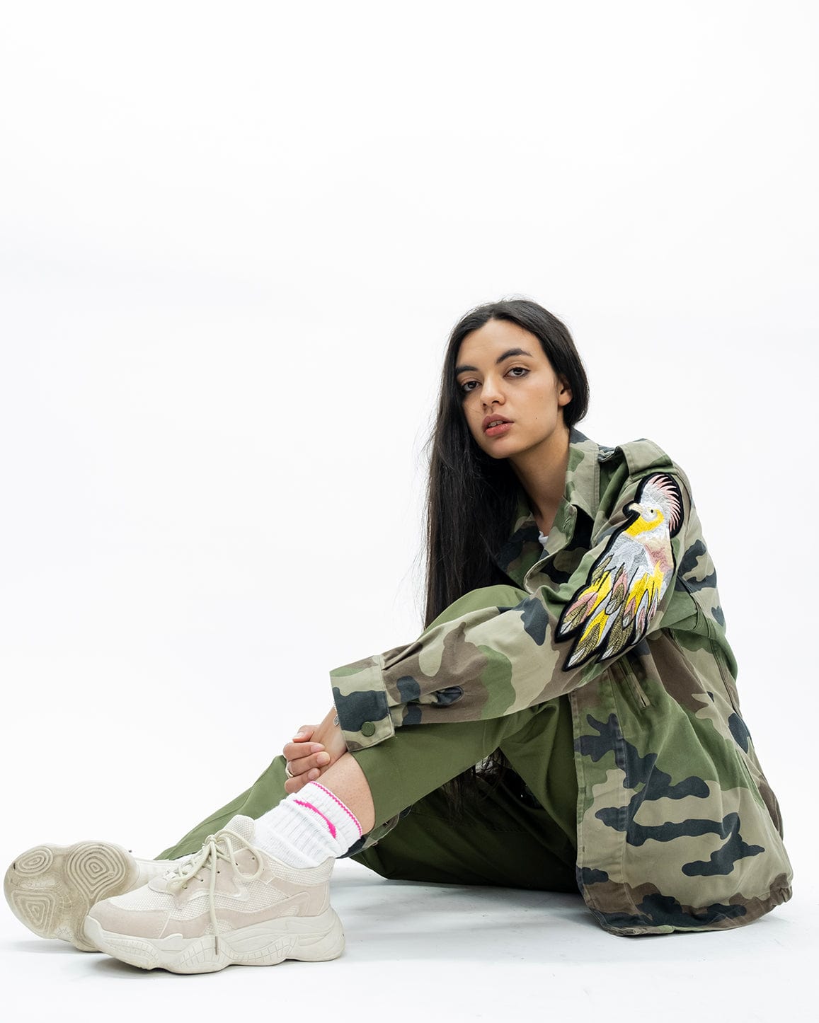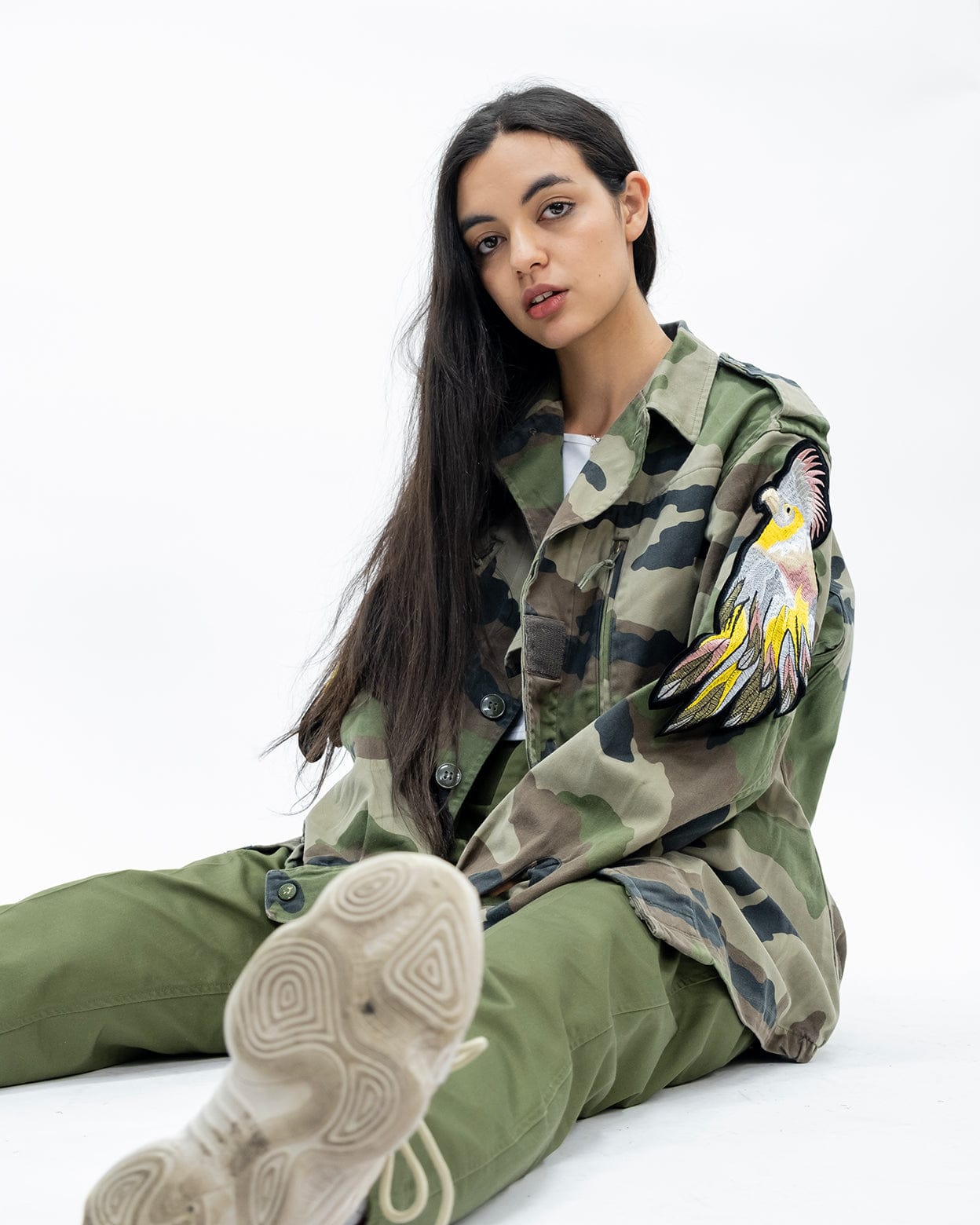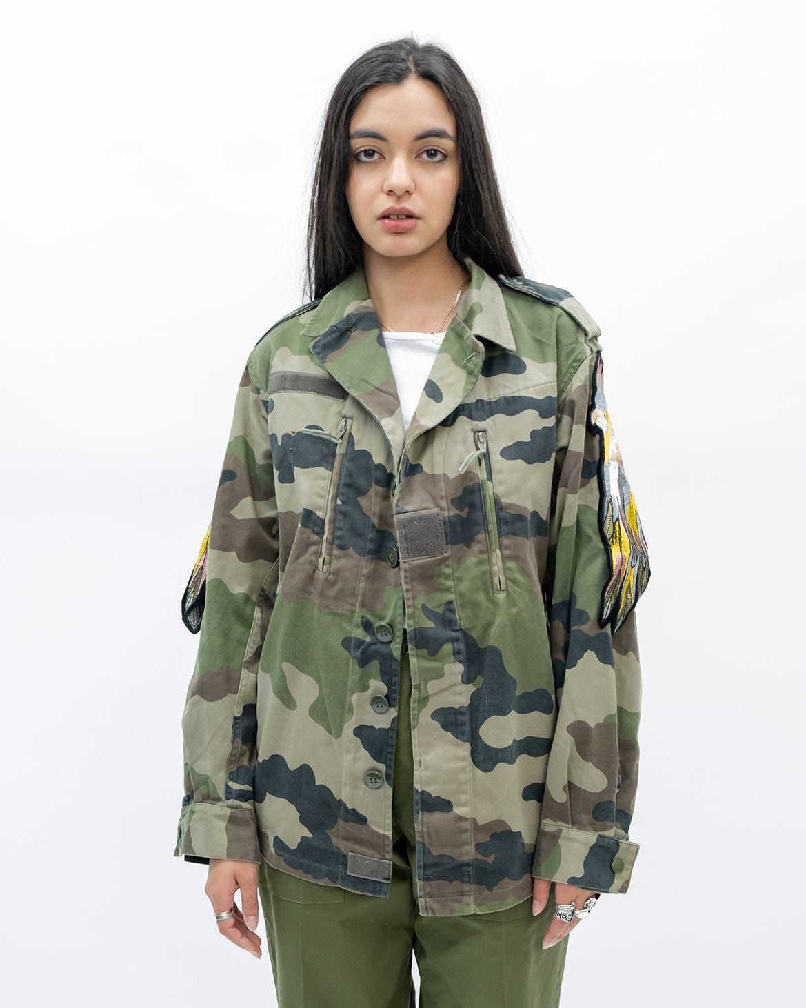 Metallic embroidered parrot-inspired appliqué shoulder patch sleeved customised army jacket with pockets and lapels.