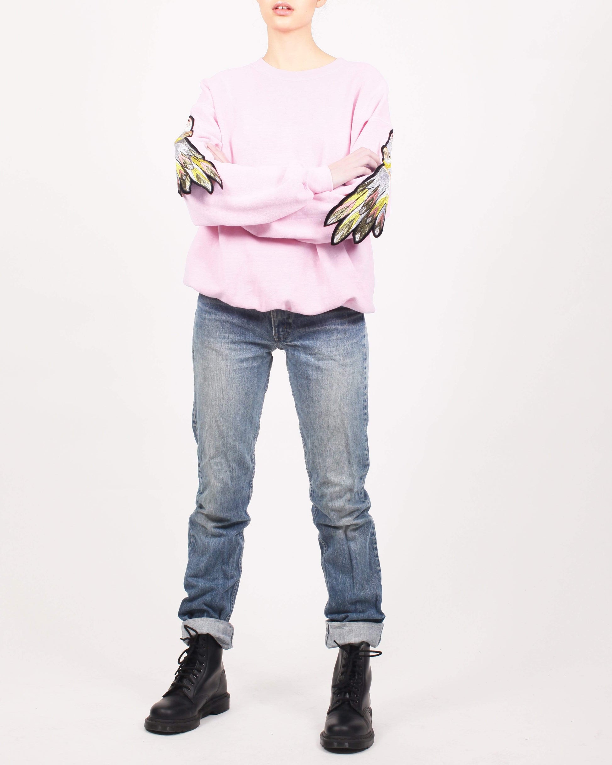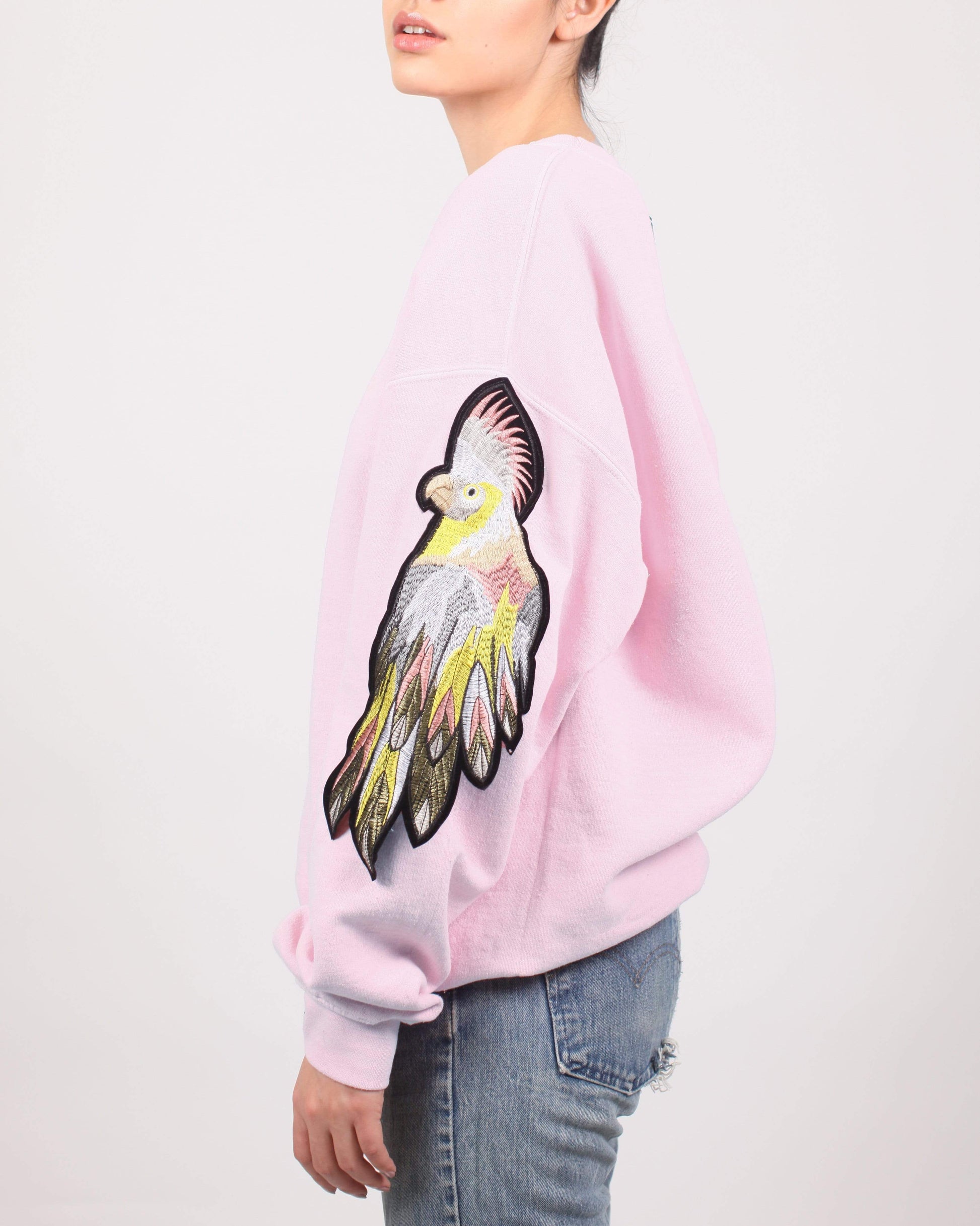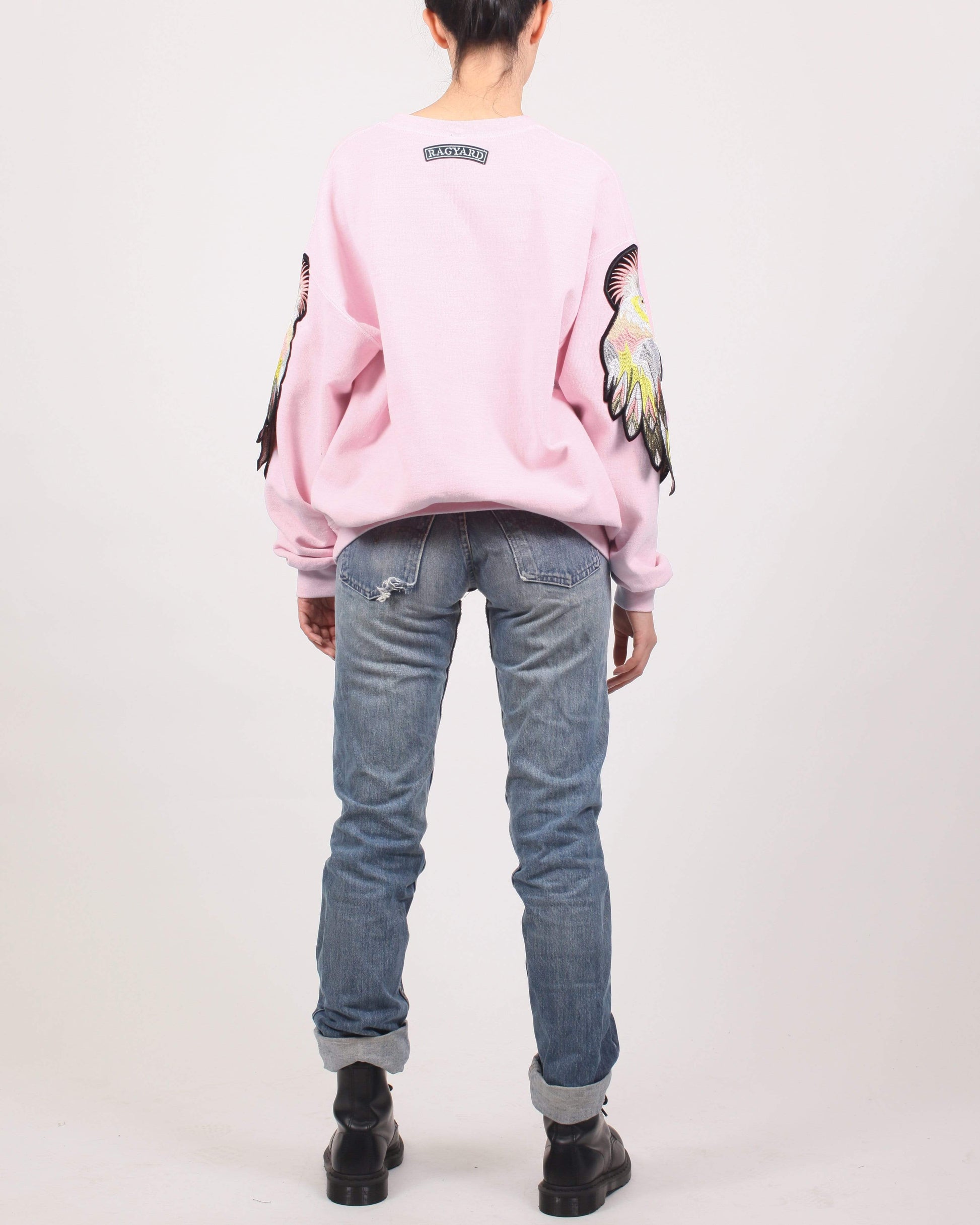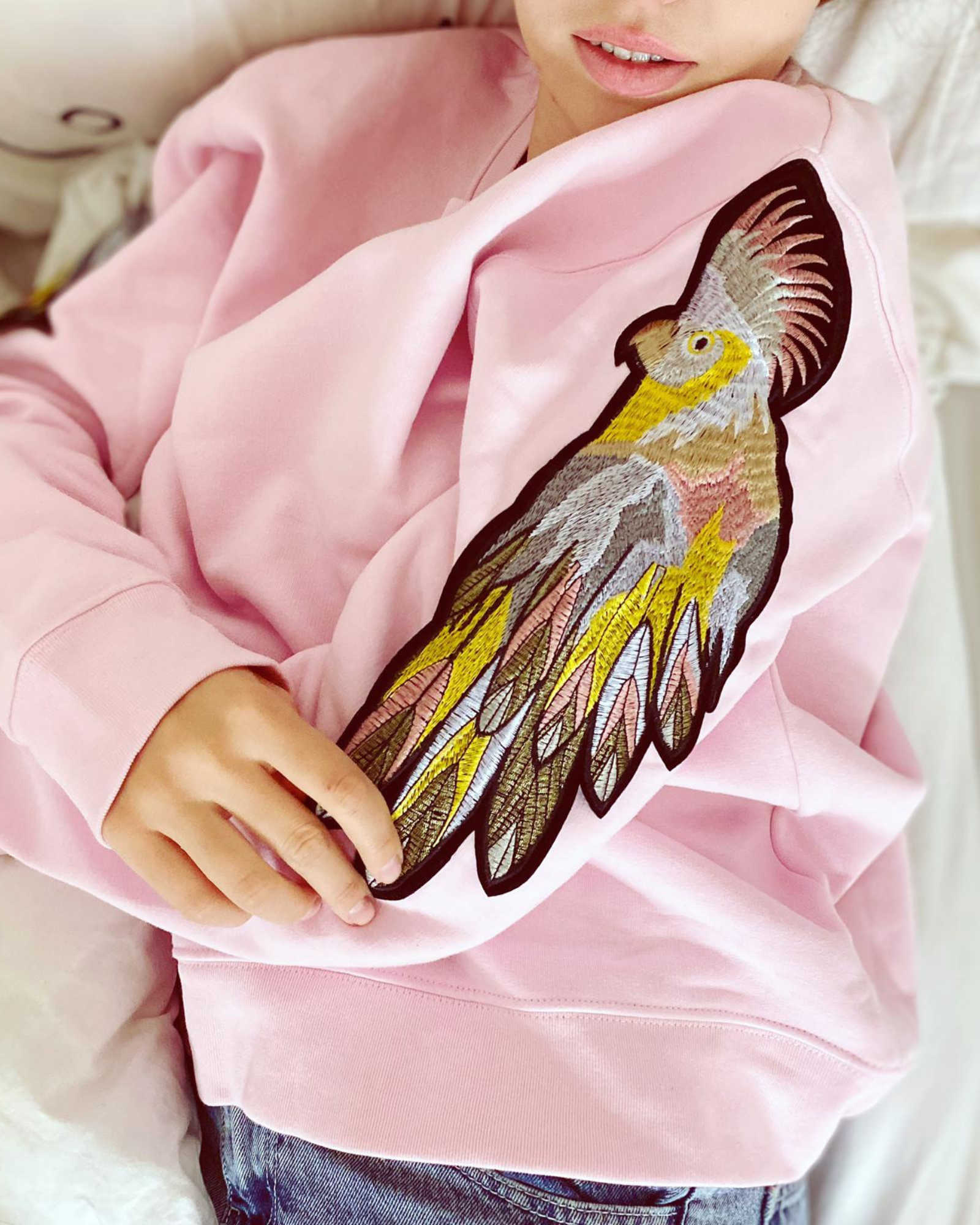 From peacocks to parrots, our metallic, embroidered parrot appliqué sleeve! It's so comfy too, on a velvety 85% organic cotton. 15% recycled polyester jersey sweatshirt.